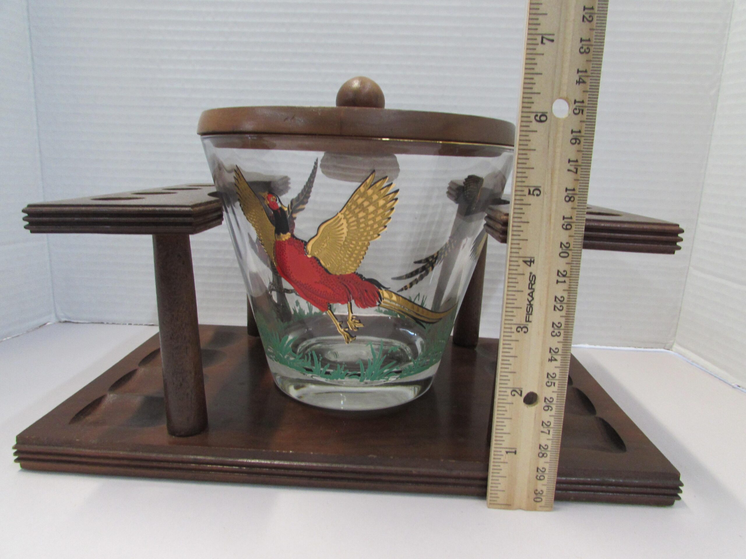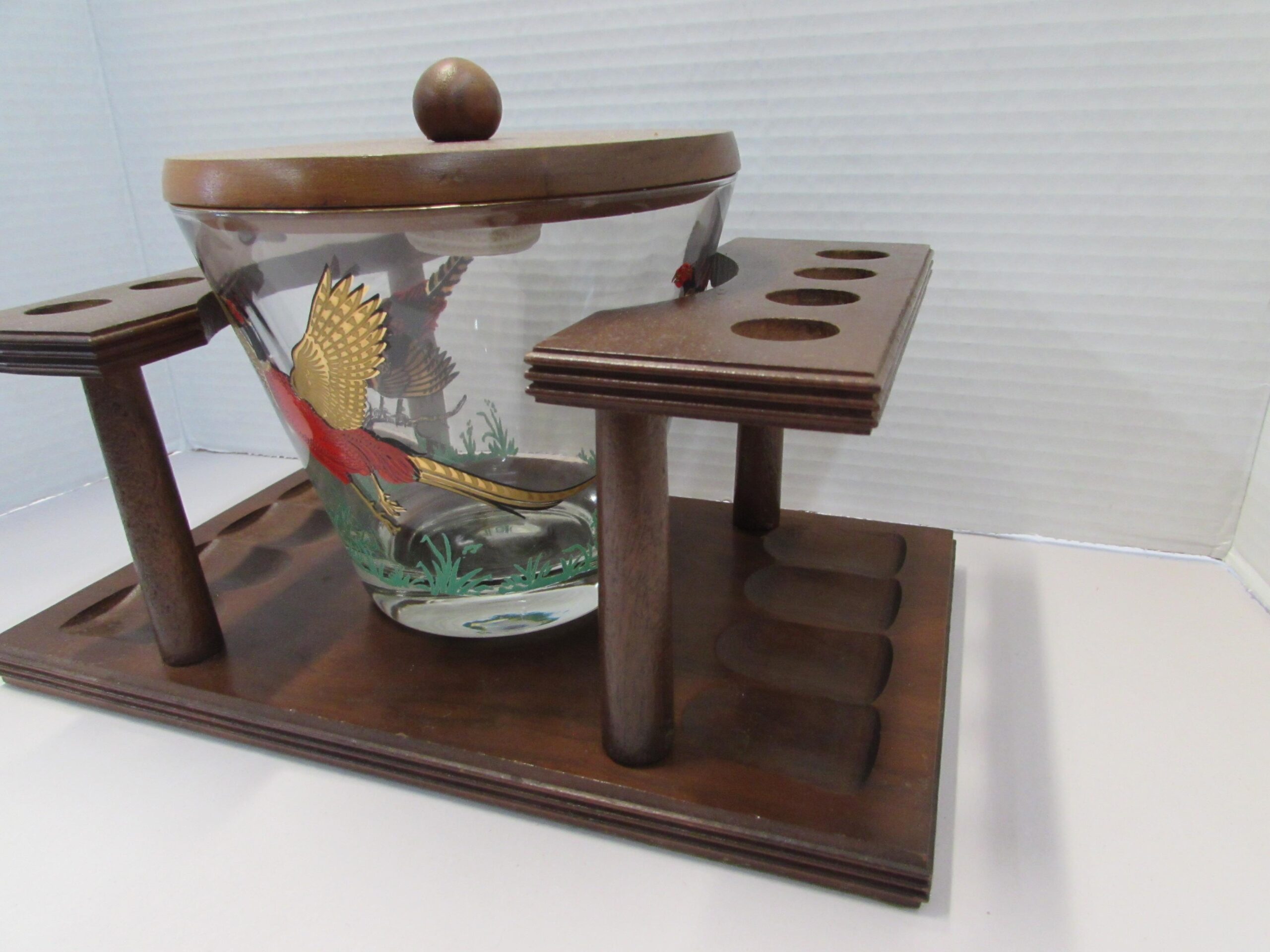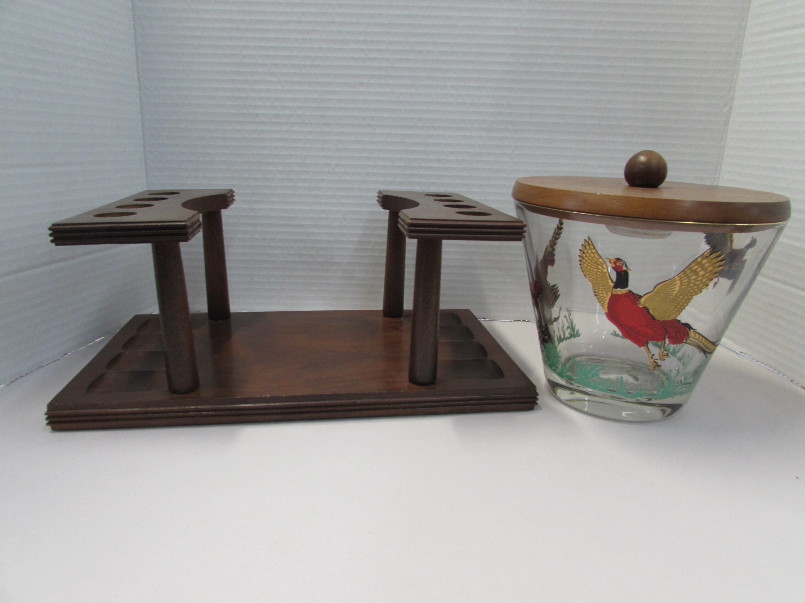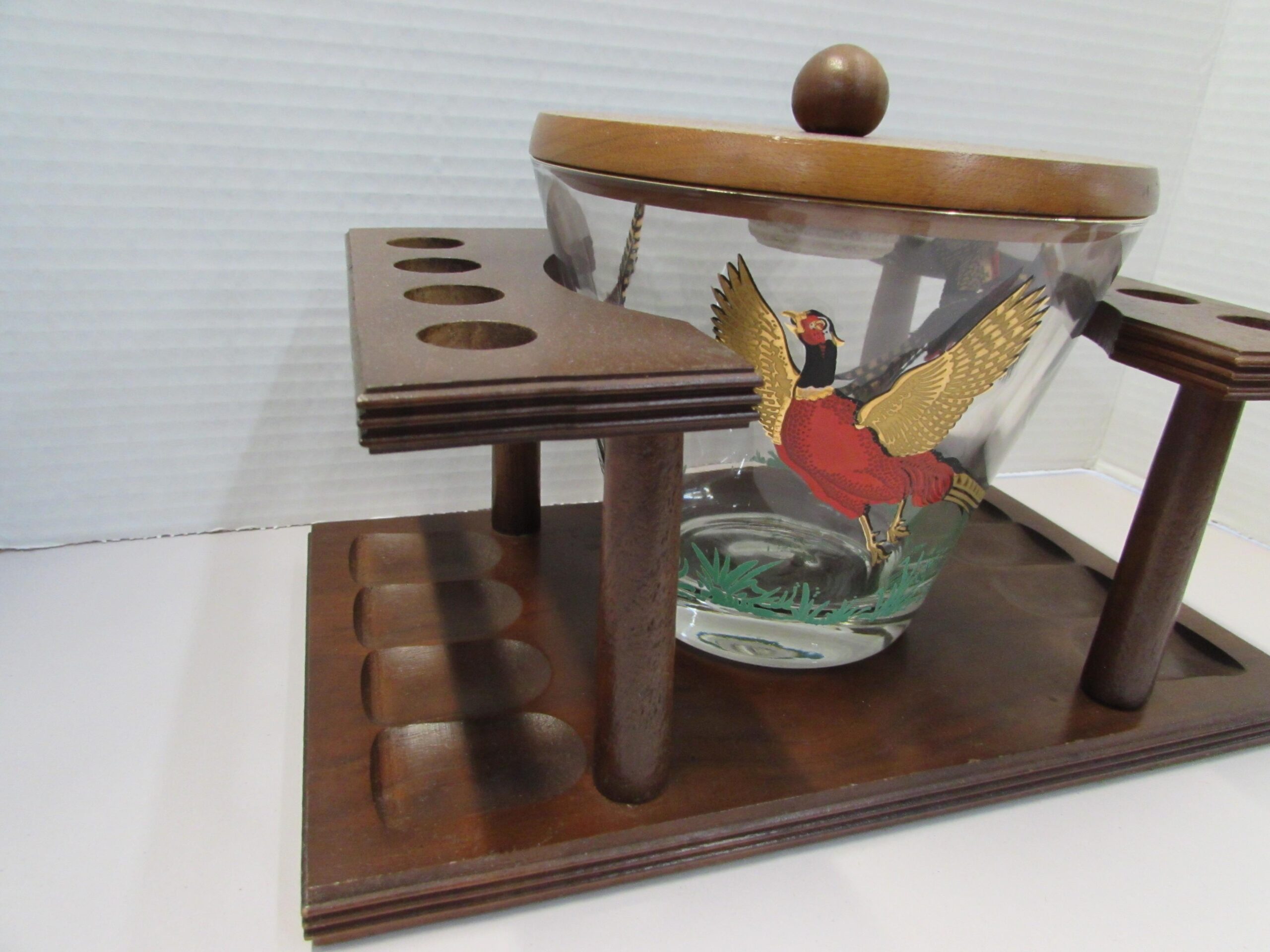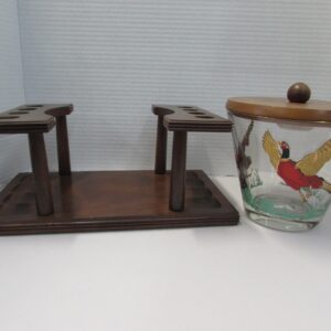 Wooden pipe holder with tobacco jar humidor, hand-painted pheasant.